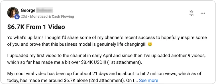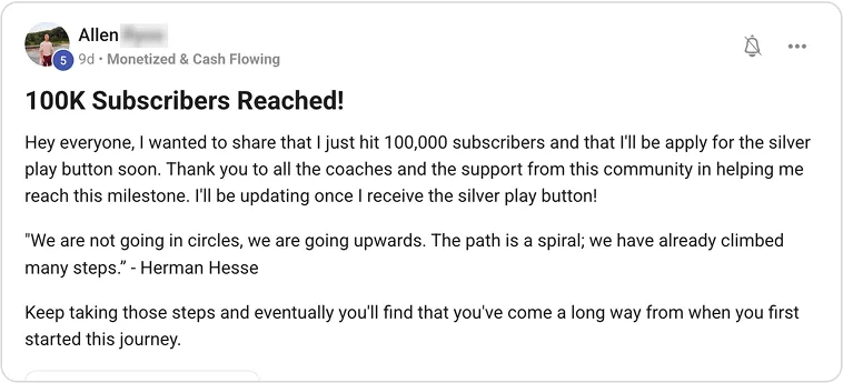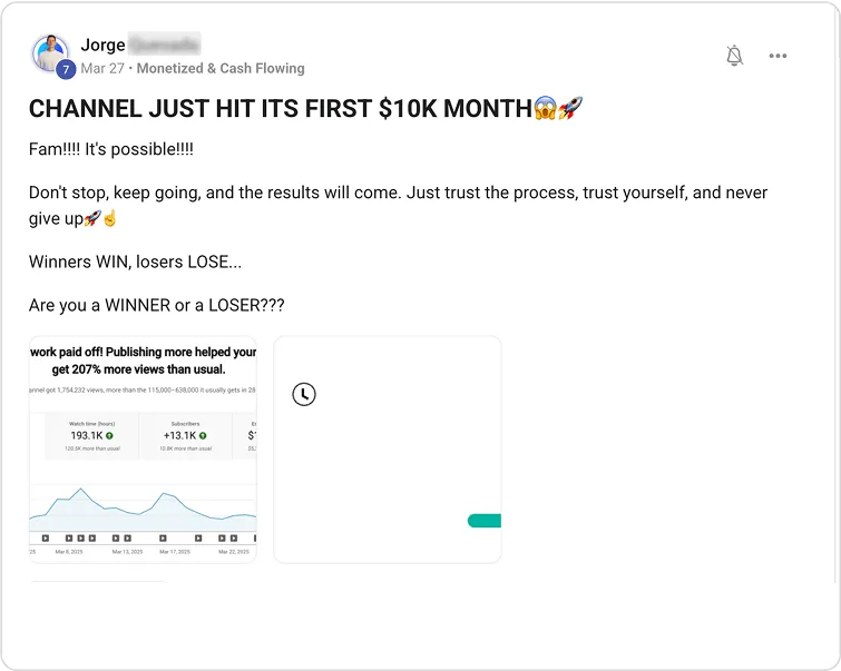 But there’s a practical upside, too: the best graduates often become partners on new channels. Their drive plus my systems create win-win ventures that expand my portfolio while giving them a fast lane to bigger profits. So teaching isn’t just paying it forward—it’s how I keep growing, together with my most successful students."